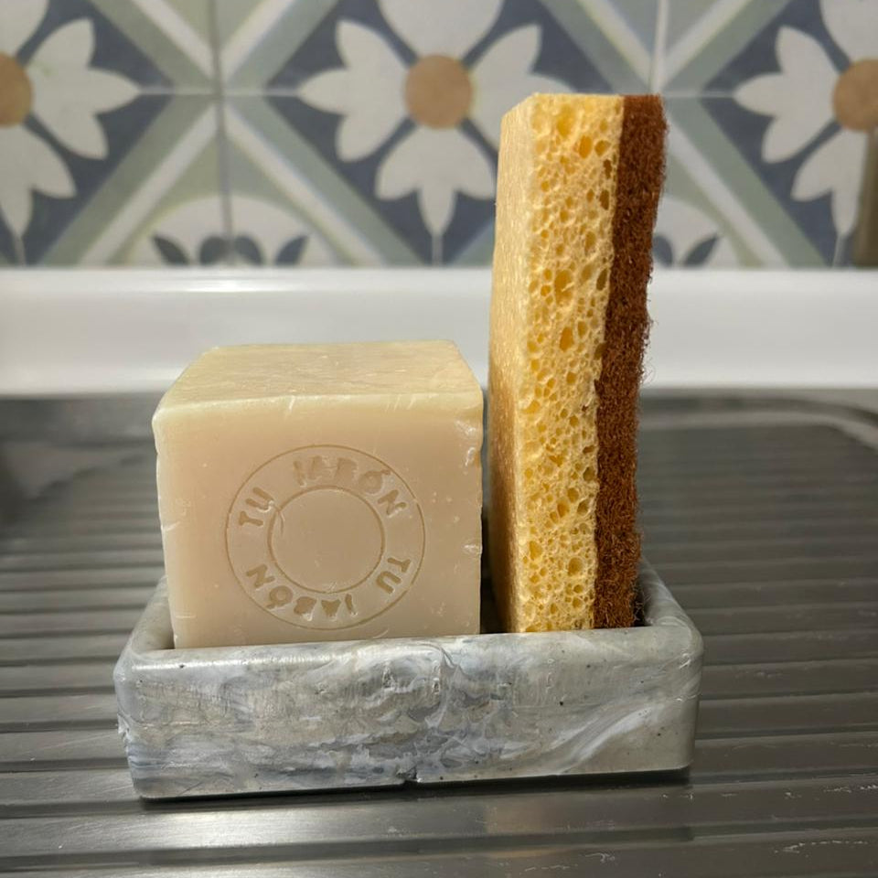 Contenido: 1 Porta Lavalozas (plástico reciclado), 1 Lavalozas en Barra Tu Jabón (220gr) y 1 Pack de Esponjas de Fibra de Coco.